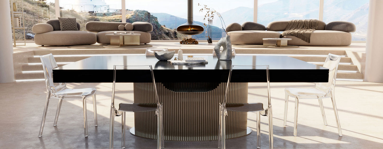 La struttura, solida e perfettamente bilanciata, è sostenuta da una scenografica gamba centrale in metallo, forata nella parte superiore: un dettaglio di stile che alleggerisce visivamente l’insieme, esaltando al tempo stesso l’eleganza e l’innovazione del design.